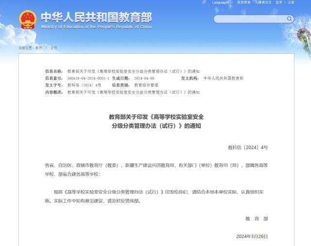 4月22日,記者從教育部獲悉,教育部印發(fā)《高等學(xué)校實(shí)驗(yàn)室安全分級(jí)分類(lèi)管理辦法(試行)》(以下簡(jiǎn)稱(chēng)《辦法》)。《辦法》指出,高校可以依據(jù)本辦法,結(jié)合自身實(shí)際,制定并實(shí)施適用于本校的實(shí)驗(yàn)室安全分級(jí)分類(lèi)管理辦法。